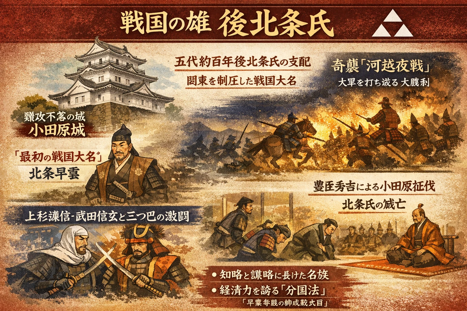 北条家最後の当主・氏直の決断 日本史 X Facebook はてブ Pocket LINE コピー 2026.03.22 本文 データ 登録 北条家北条氏直は戦国末期の武将で、後北条氏最後の当主である。父・北条氏政から家督を継ぎ、関東の大勢力を維持したが、豊臣秀吉の天下統一の流れに抗しきれなかった。小田原征伐で降伏し、家臣の助命を願うなど責任を果たしたが、これにより北条家は滅亡した。 年表 項目 通知 表示 通知 × 時間軸 分類 通知1 選択 通知1 時間 通知1 地図 項目 通知 表示 通知 リンク伊勢盛時, 北条氏綱, 北条氏康, 北条氏政, 北条氏直 一覧検索:全てtitle全て区分分類genre 追加所属全て全てグループ出来事全て全てチーム全て全て競技等全て全て 編集分類genre基本data リセット 名前 通称 誕生 没年 出身地 学歴等 プロ入り 引退 概要 id 出来事event name 名称 場所 時期 概要 id id_data id_event list_id list_name 所属belong 特徴 開始時期 終了時期 概要 id id_data id_belong list_id list_name list_parent チームteam name 特徴 開始時期 終了時期 概要 id id_data id_team list_id list_name 競技等rank name 順位等 時期 概要 id id_data id_rank list_id list_name 申請 登録 削除削除理由 送信送信中です。ご協力ありがとうございました。登録申請に失敗しました。申請に失敗しました。