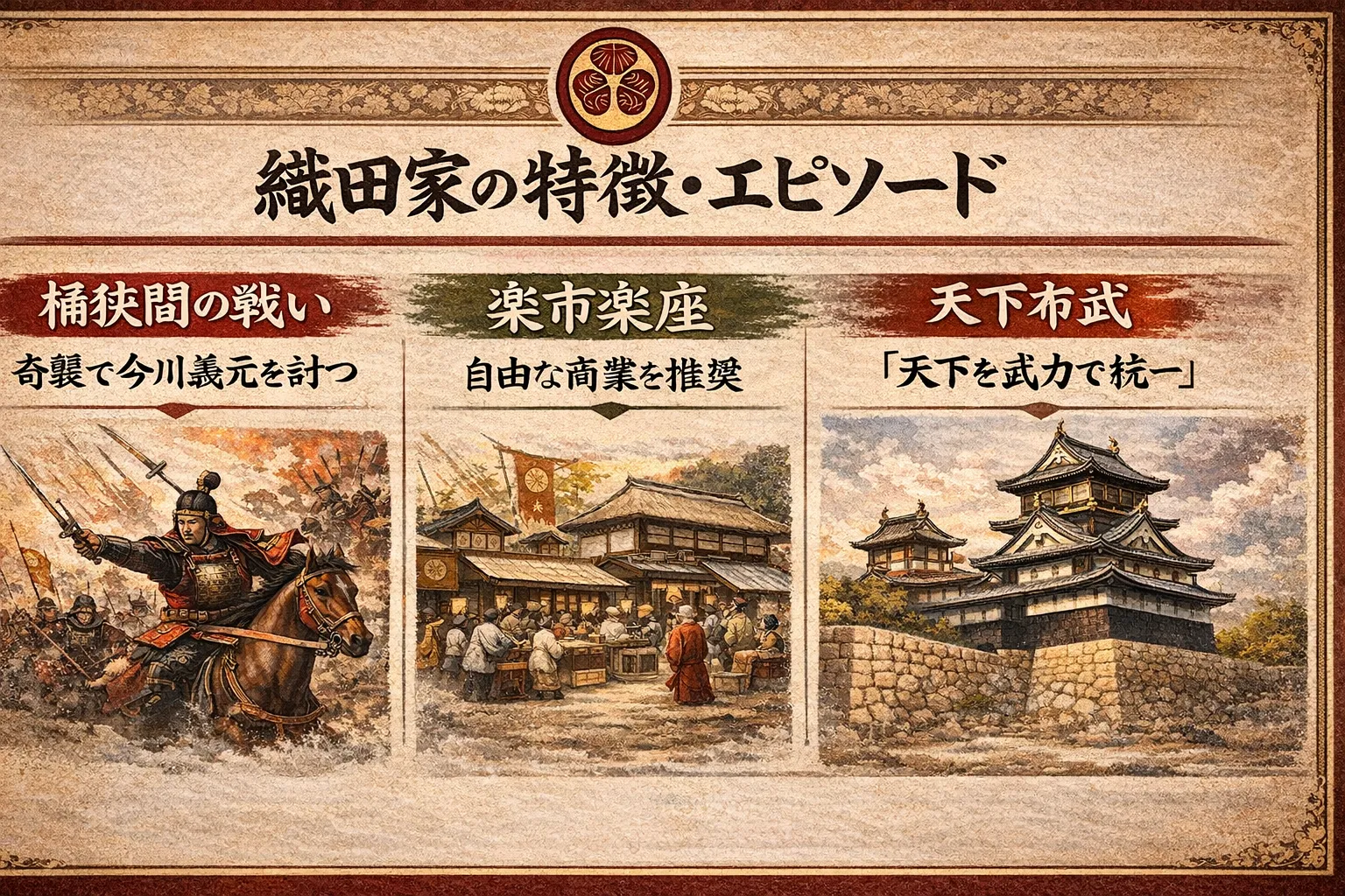 織田信長を中心とする織田家は、戦国大名の中でも革新性で人気があります。鉄砲の大量運用や楽市楽座などの経済政策、比叡山焼き討ちなどの強硬策で知られます。1560年の桶狭間の戦いで今川義元を破り台頭。安土城築城など新しい文化も生み出し、「天下布武」を掲げた点が大きな特徴です。